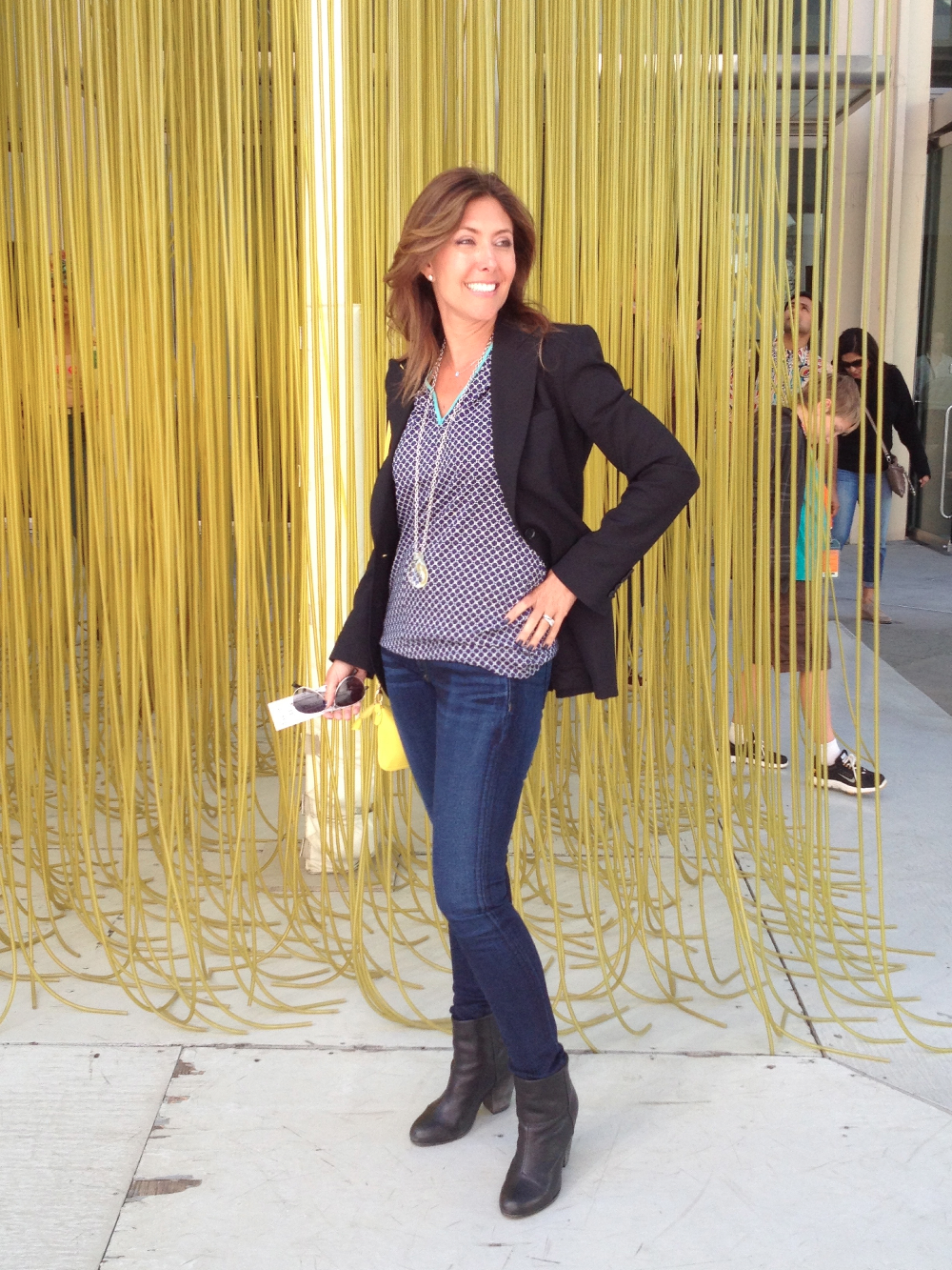 At LACMA in front of Penetrable sculpture by Jesus Rafael Soto. Wearing Vince Camuto sleevless top, Dolce & Gabanna boyfriend blazer and Rag & Bone jeans and boots.