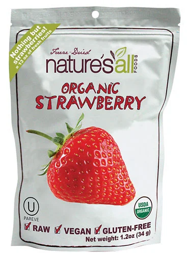 Organic Strawberries from Nature's All Foods are yummy freeze-dried strawberries that are sweet and provide a natural source of vitamin C. They are a great addition to cereals, lunch boxes, desserts or just by themselves as a crunchy snack. They are raw, vegan, free of gluten, GMOs, colorings, preservatives, added sugar, wheat, dairy, peanut and tree nuts making it the perfect sweet snack for those with restrictive diets.