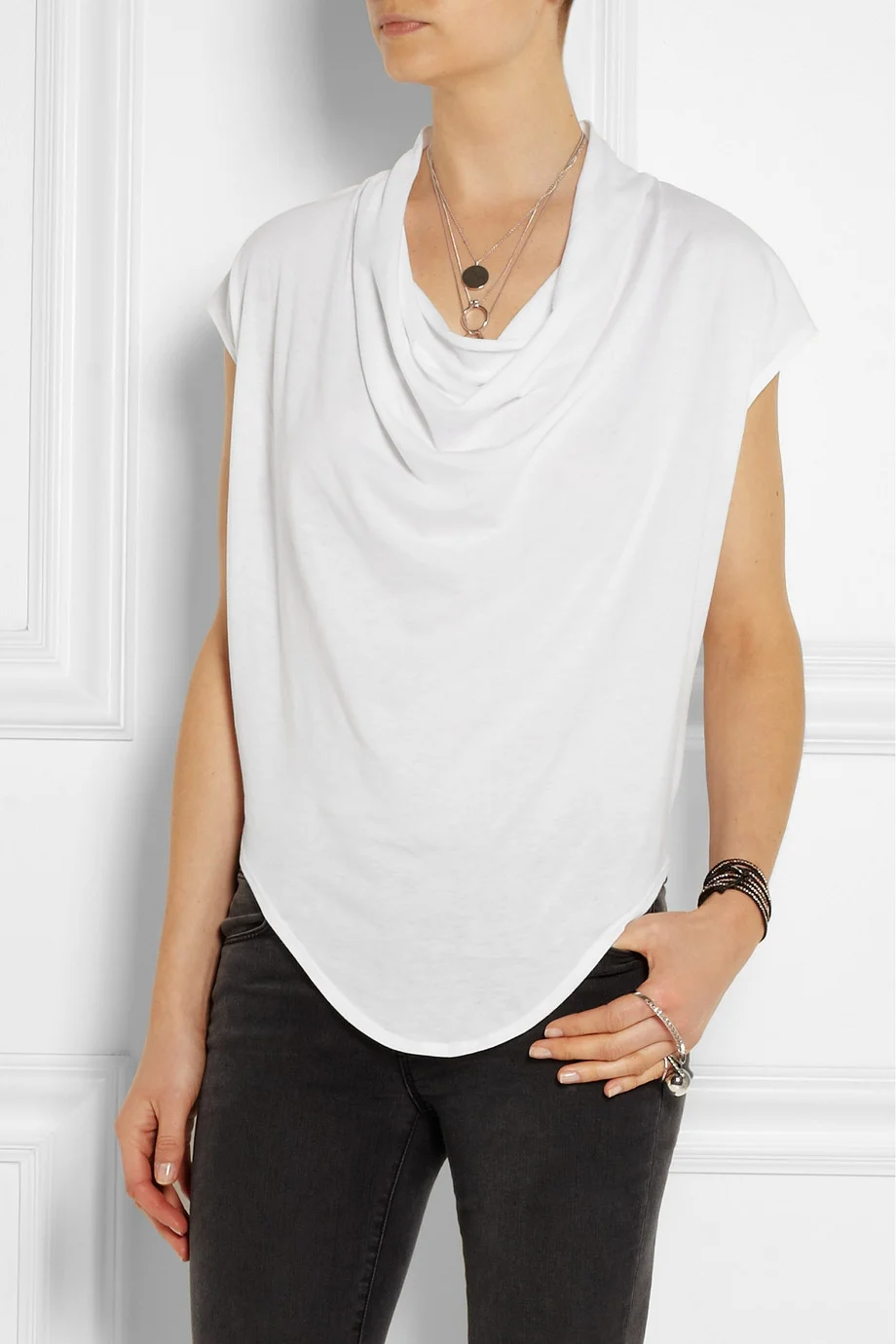 I am huge fan of everything Helmut Lang, especially this white draped, cowl-neck t-shirt. It's perfect to wear when you want to dress up your casual look.