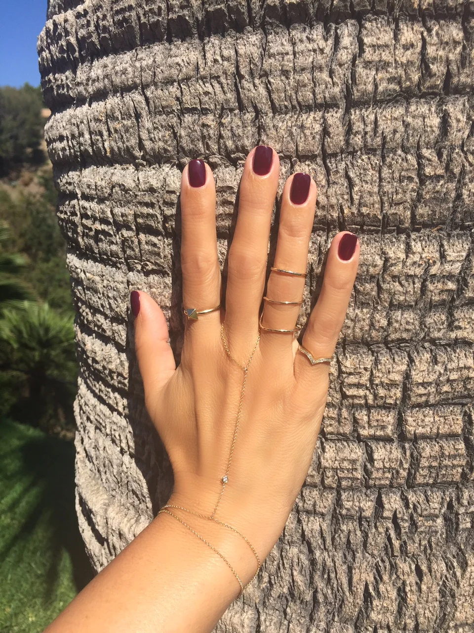 This color is my favorite from essie's Fall Collection 2015. It's similar to their oxblood red but revamped to be sweeter with a purplish tinge. I love the look of combining several delicate gold, rings (pinky, stacked and midi) and a hand chain when wearing this beautiful, bold shade.