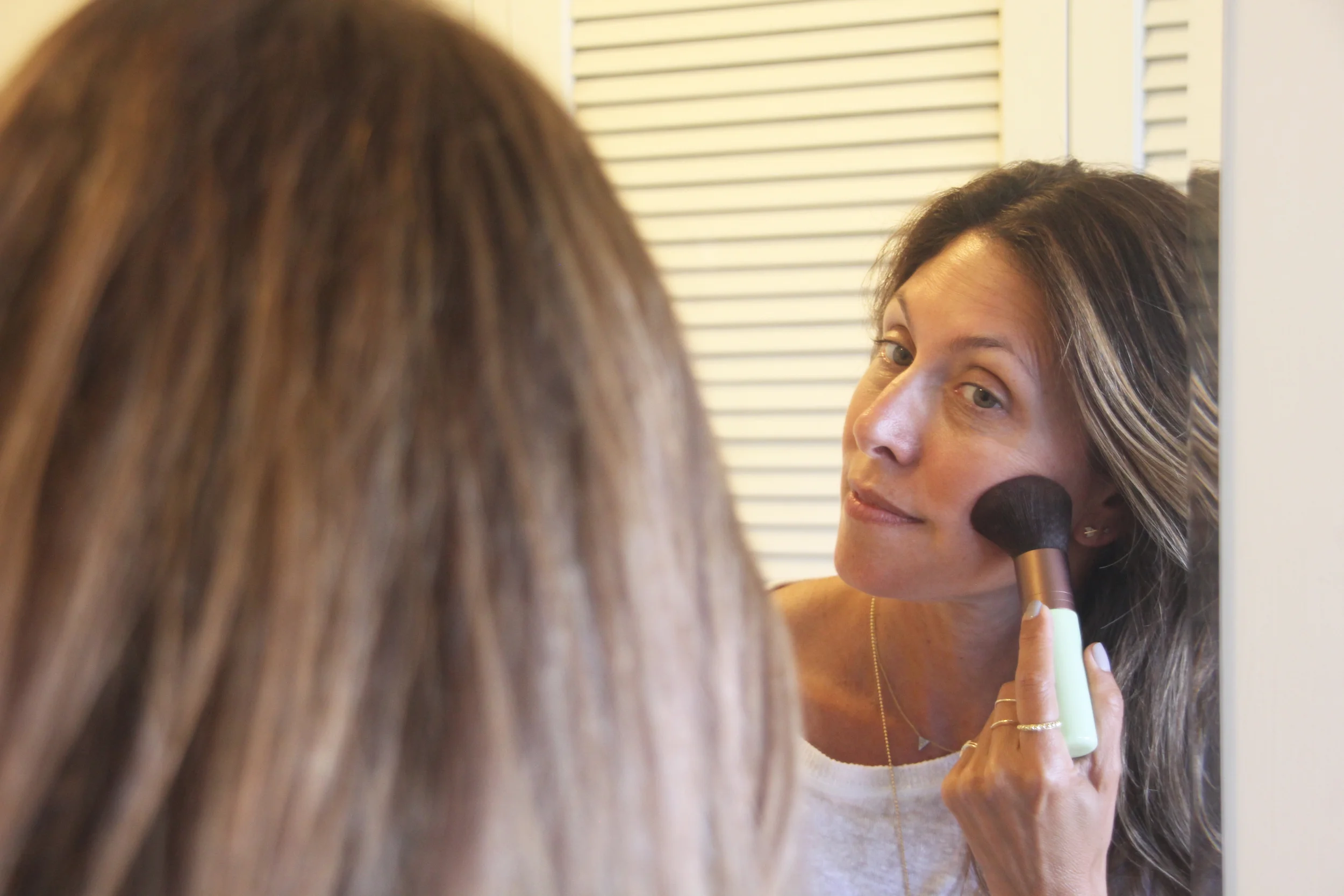 On a clean moisturized face, I like to prep first by applying bronzer with the fluffy Pixi cheek brush. It helps to add color to my face!