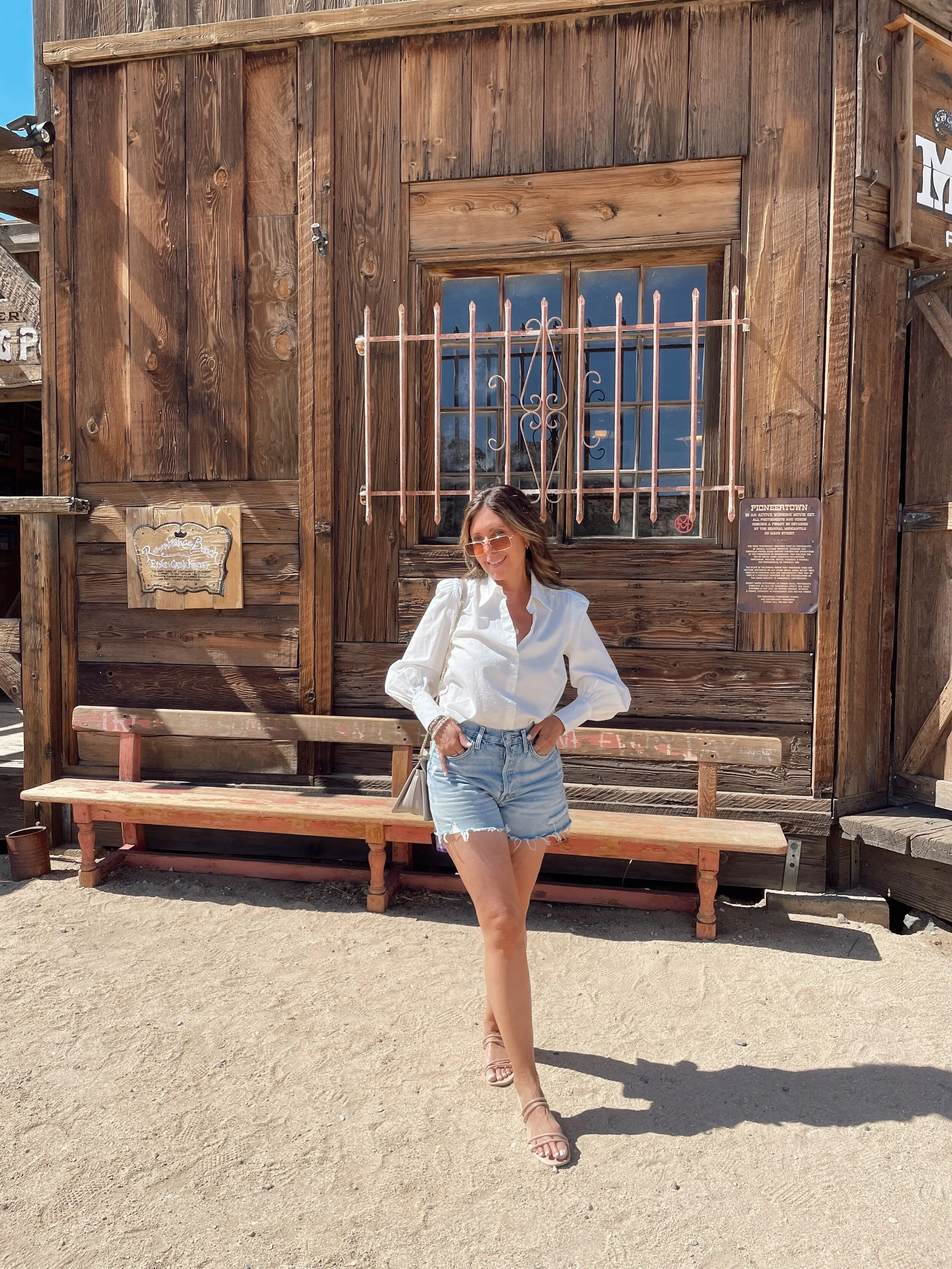 SHOP St. Roche top, Agolde denim shorts, and Dolce Vita sandals