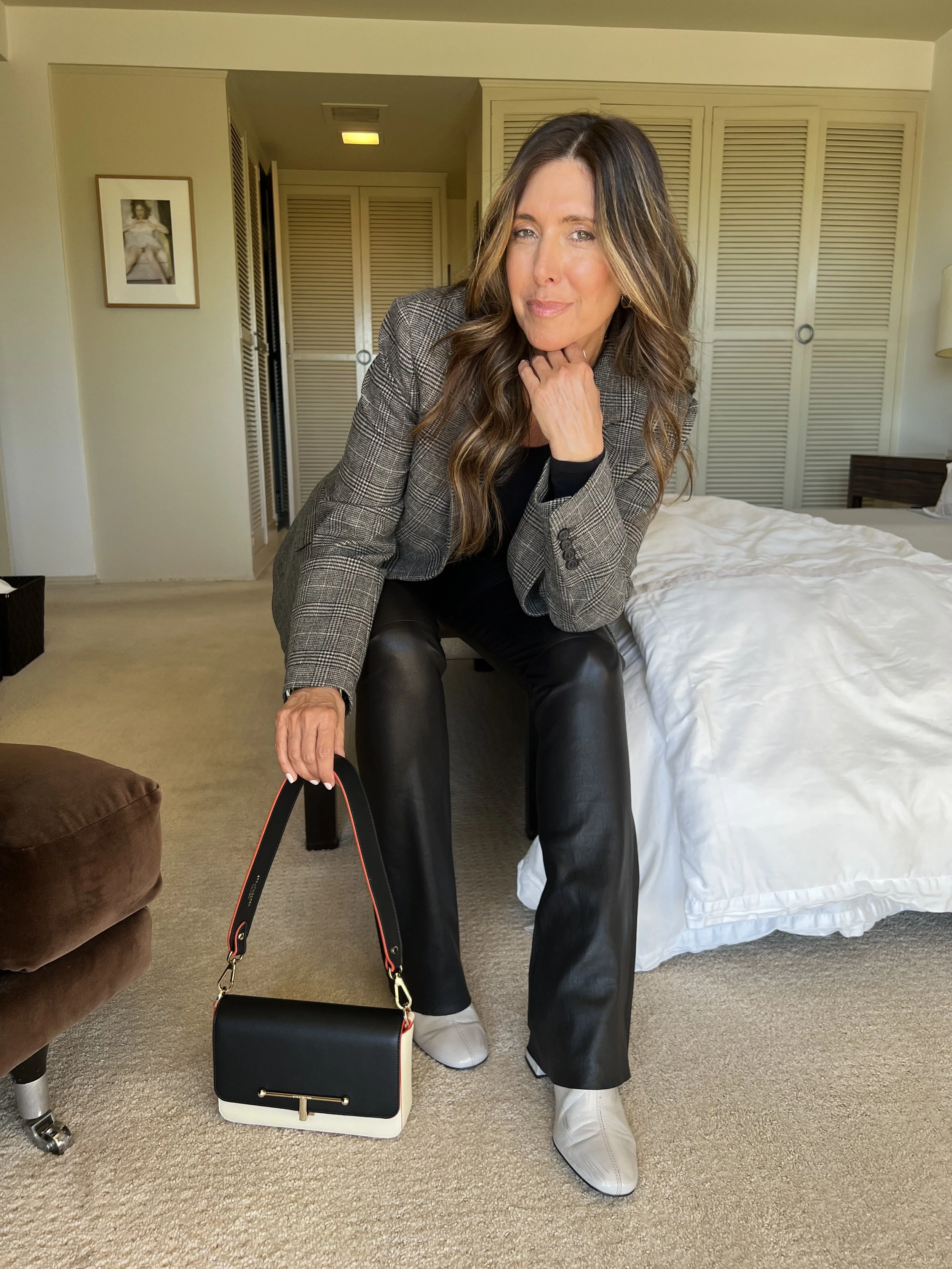 Bag: Strathberry, Blazer: Zara, Faux Leather Pants: Agolde, Boots: Zara