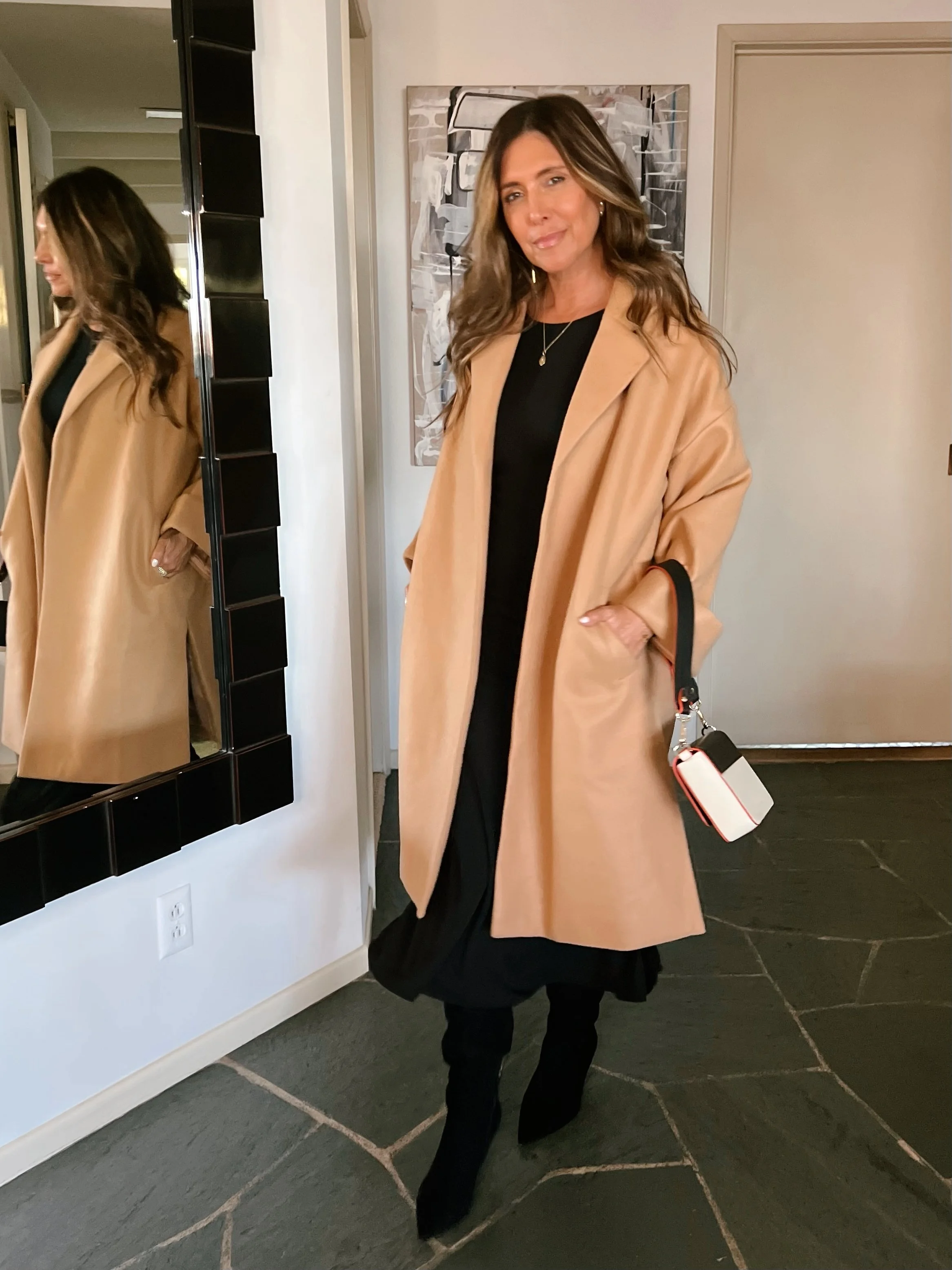 Coat: LBLC The Label: Use code GLOWGIRL10 for 10% off. Dress: Mango (on sale, $30), Black Suede Boots: Who What Wear, Bag: Strathberry