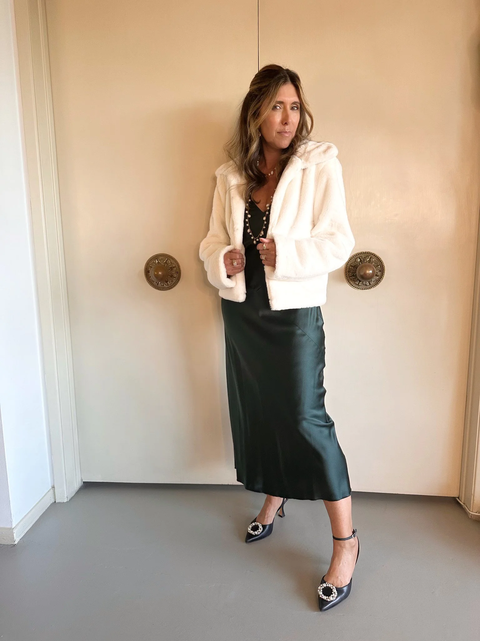 Styled here for the perfect holiday glam look, I layered the faux fur jacket over a dark emerald slip dress, a long pearl necklace, and my favorite sparkly Cinderella pumps. This sophisticated look is perfect to wear for all holiday events and beyond!