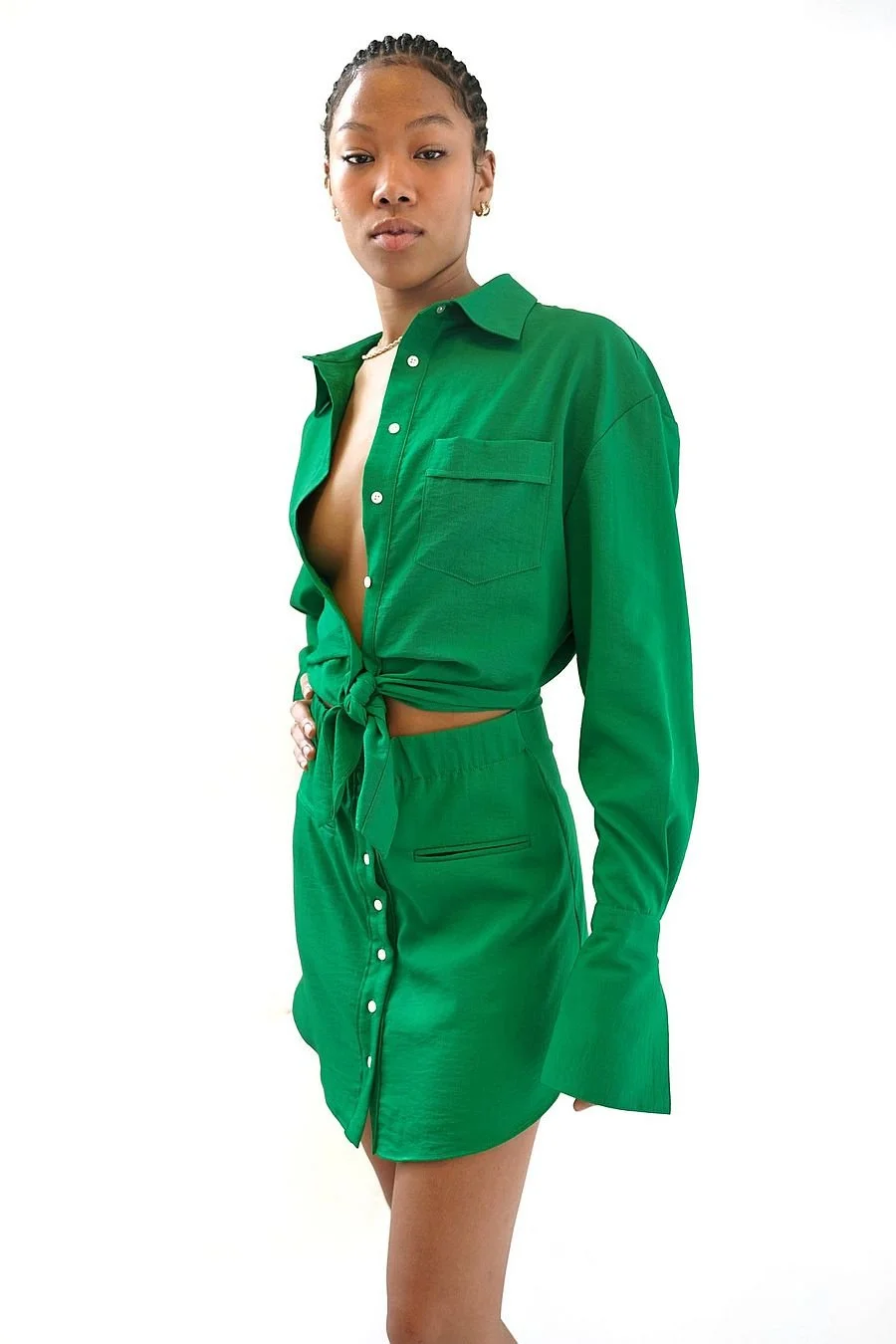 This bright green mini-dress is like wearing your favorite button-down shirt that ties at the waist and has an oversized long sleeve for extra style. I love that it can be worn from day to night and makes a great travel piece. It’s super flattering and chic!