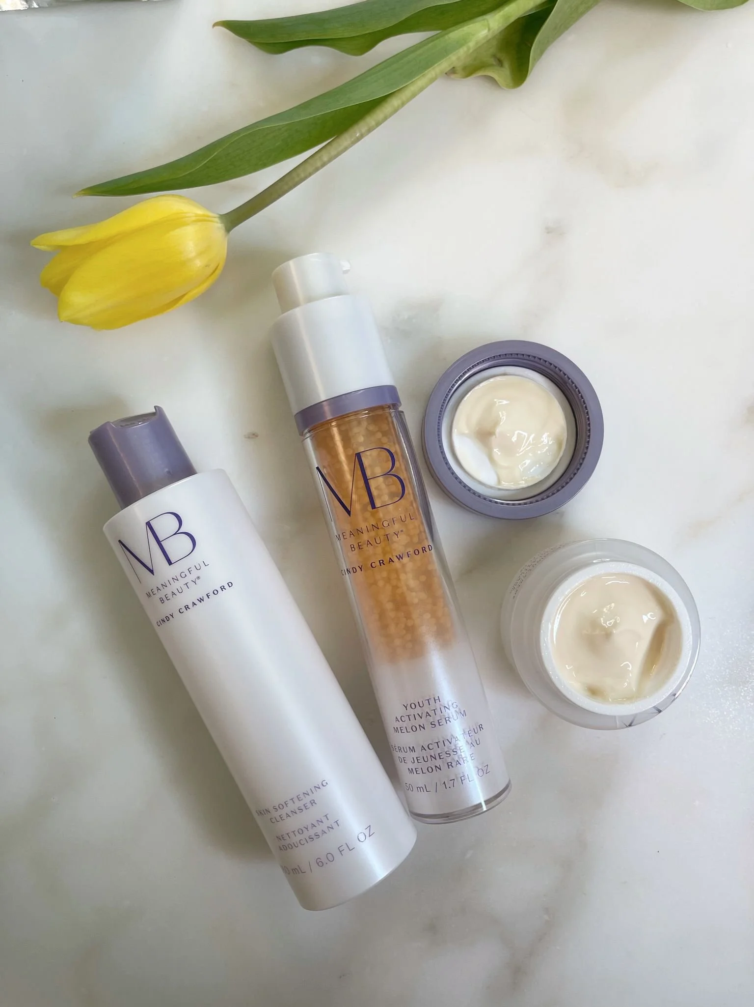 I want to tell you about some amazing products I’ve been using lately that have given me incredible results! Have you heard of Meaningful Beauty? The brand launched in 2004, so it has definitely stood the test of time! These are the signature skincare products developed by uber Glow Girl Cindy Crawford and her French anti-aging specialist, Dr. Jean-Louis Sebagh. These products contain a proprietary Melon Leaf Stem Cell Technology with powerful antioxidants derived from rare melons grown in the South of France. I’ve been a big fan for a while now, and I am excited to share some of my favorites from their collection. Read on for more details!