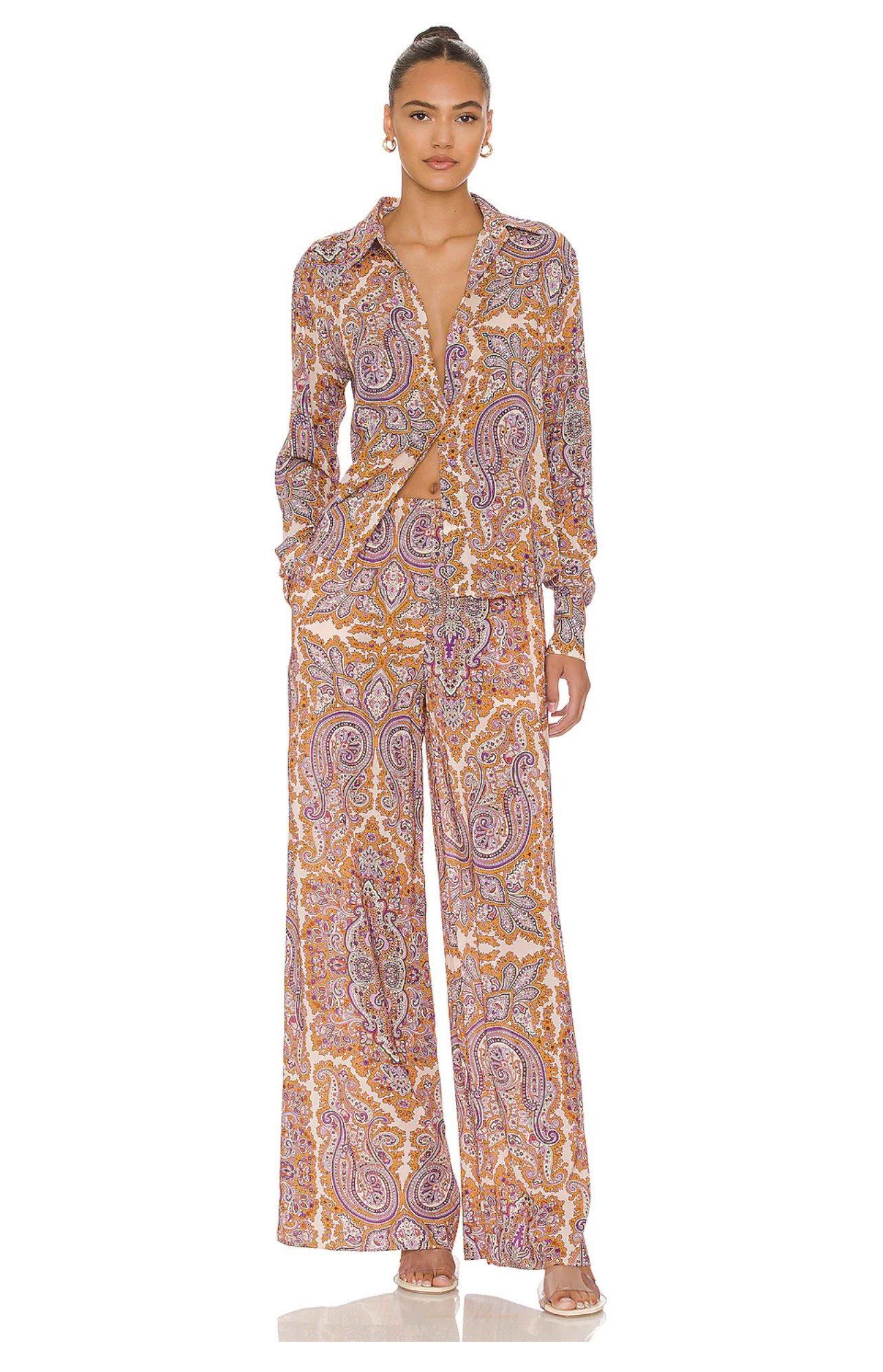 This paisley printed set from L’Academie is guaranteed to give you an effortlessly chic summertime look. Not only am I obsessed with the retro print, but the airy chiffon material is so lightweight and breathable which is perfect for those warmer summer days and nights. I love to style this set with a pair of nude mules, casual pouchy bag, and lots of gold accessories! This gorgeous print is also available in lots of different styles and also comes in a super cute dress.
