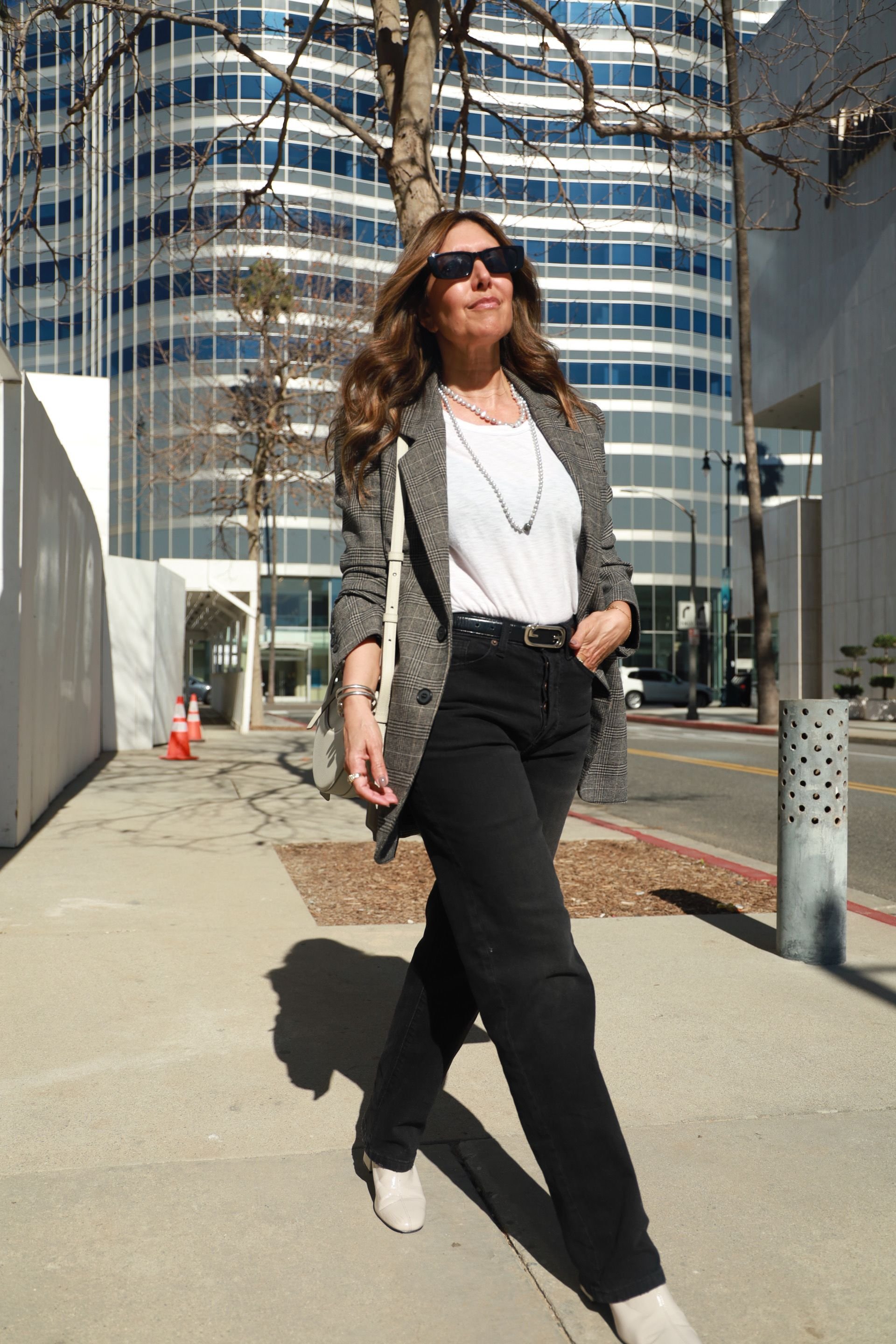 The oversized blazer is one of my favorite trends of the year and is perfect for cooler nights. It automatically elevates even a basic outfit. I love to style my patterned blazer with a simple slip dress and my solid-colored blazers with a pair of trousers or jeans for a more casual look.
