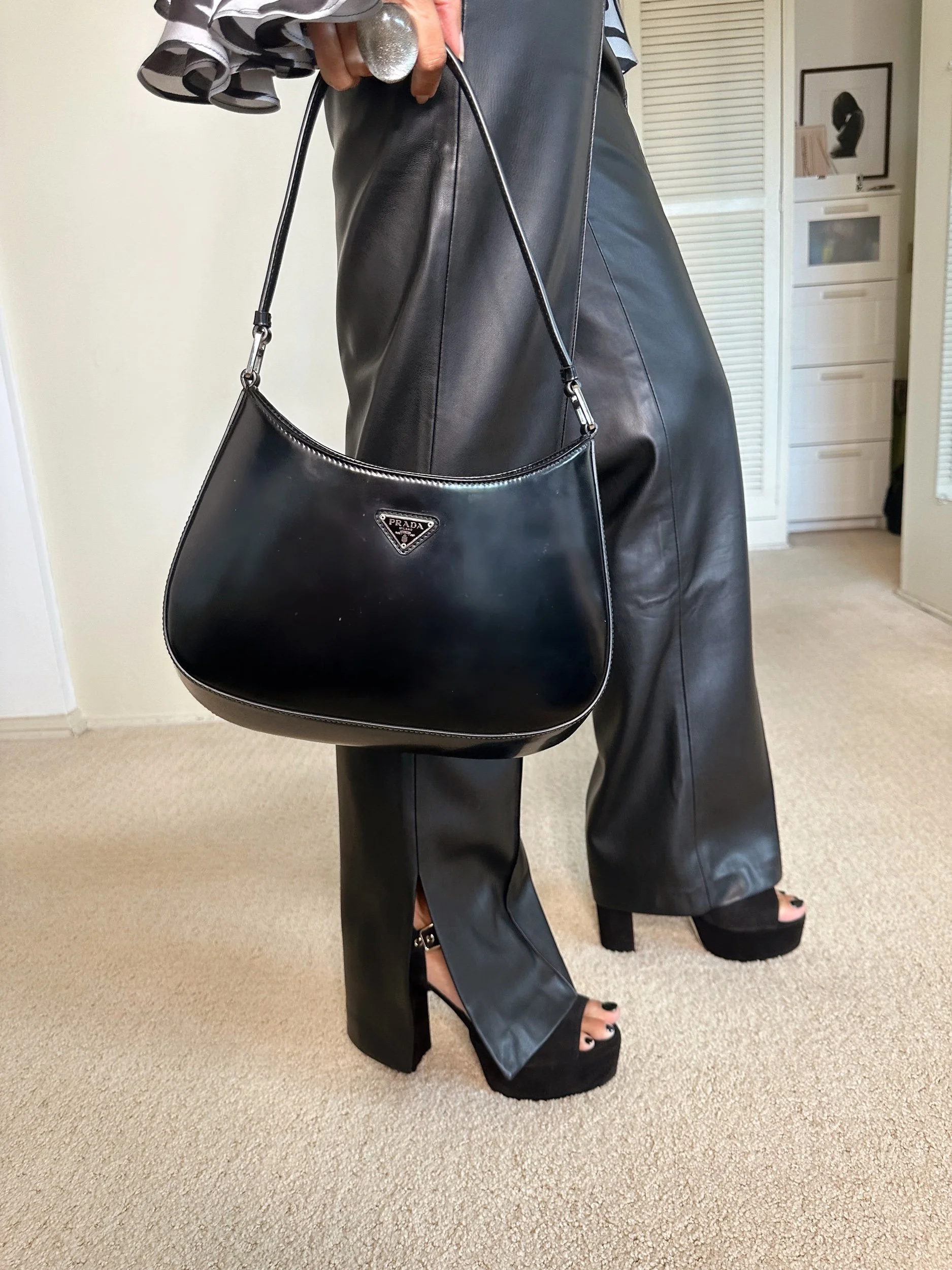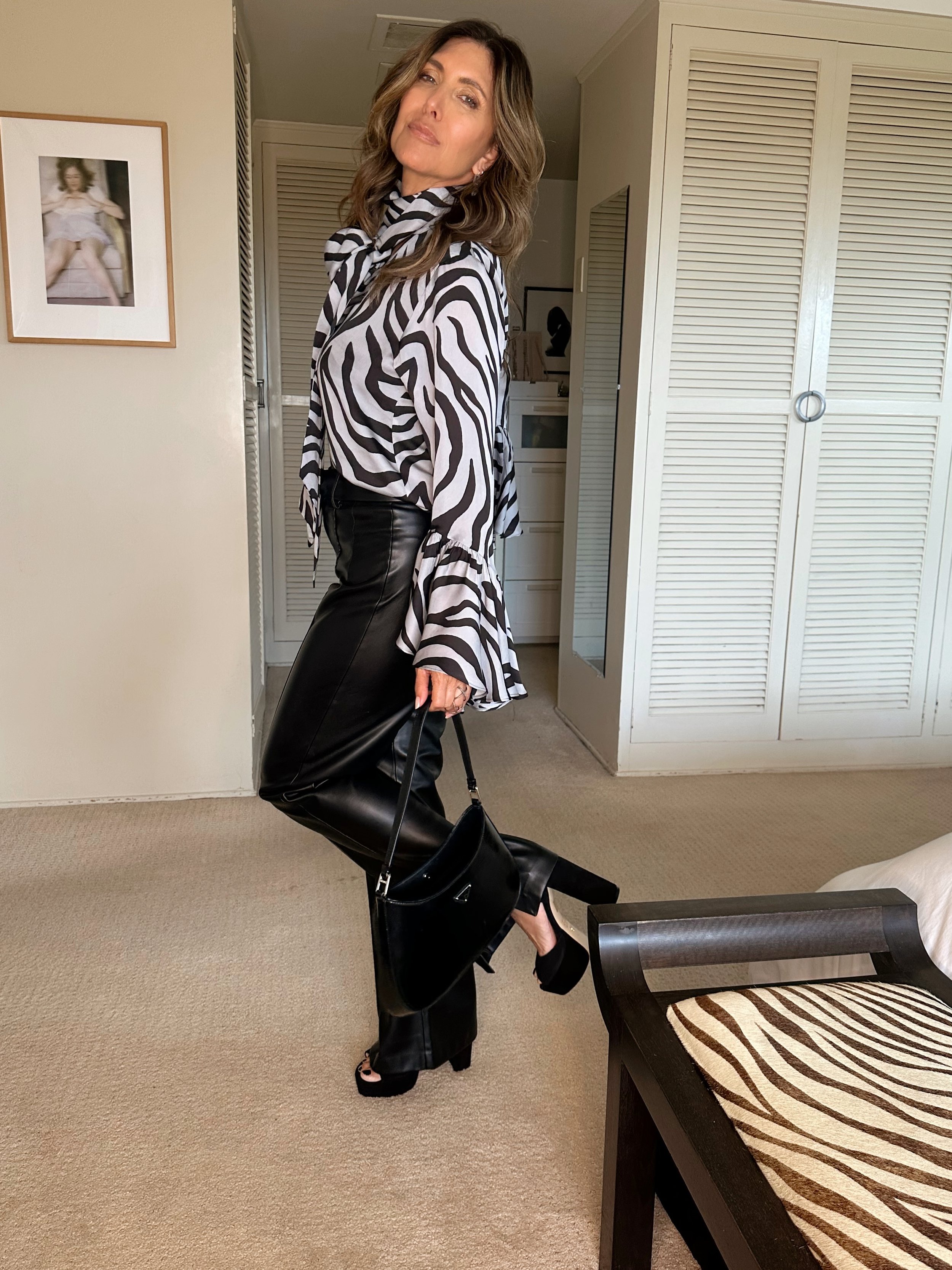 I like going out to dinner several nights a week and always make sure I have a great outfit to wear on hand. These days, I’ve been living in my faux black leather pants paired with a stylish ruffled-sleeve blouse and platform shoes. This look is always polished and elegant. And, it can be mixed and matched with lots of other items in your wardrobe. Keep scrolling to see and shop this full look including accessories.