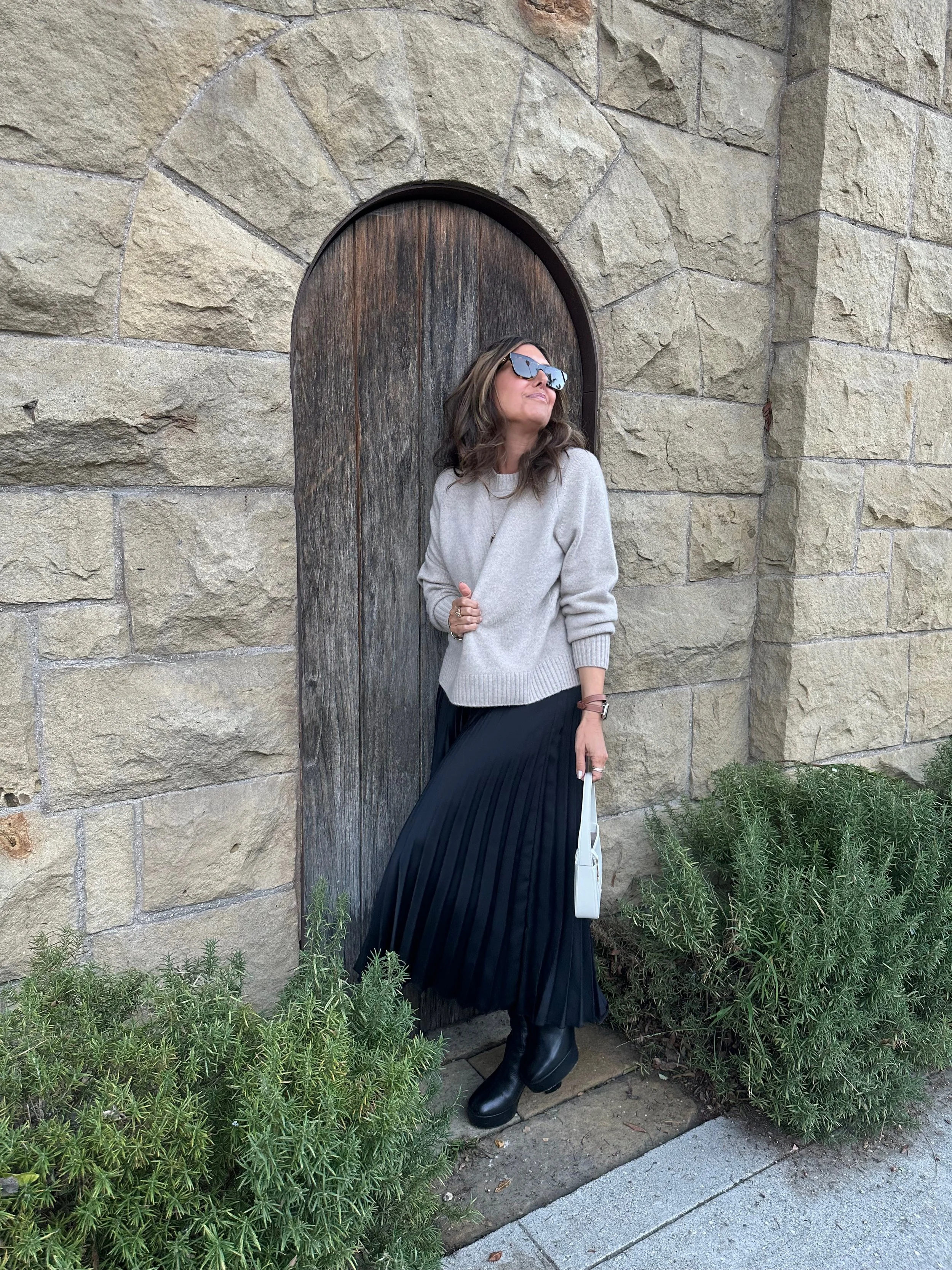Everyone needs a black pleated skirt as part of their capsule collection, and this trend is here to stay. This go-to skirt is super versatile, and the pleats look polished and chic. You can create so many different looks when wearing it, depending on your footwear and accessories. I’ve been wearing mine with chunky boots lately (shown) for a cool-girl vibe.