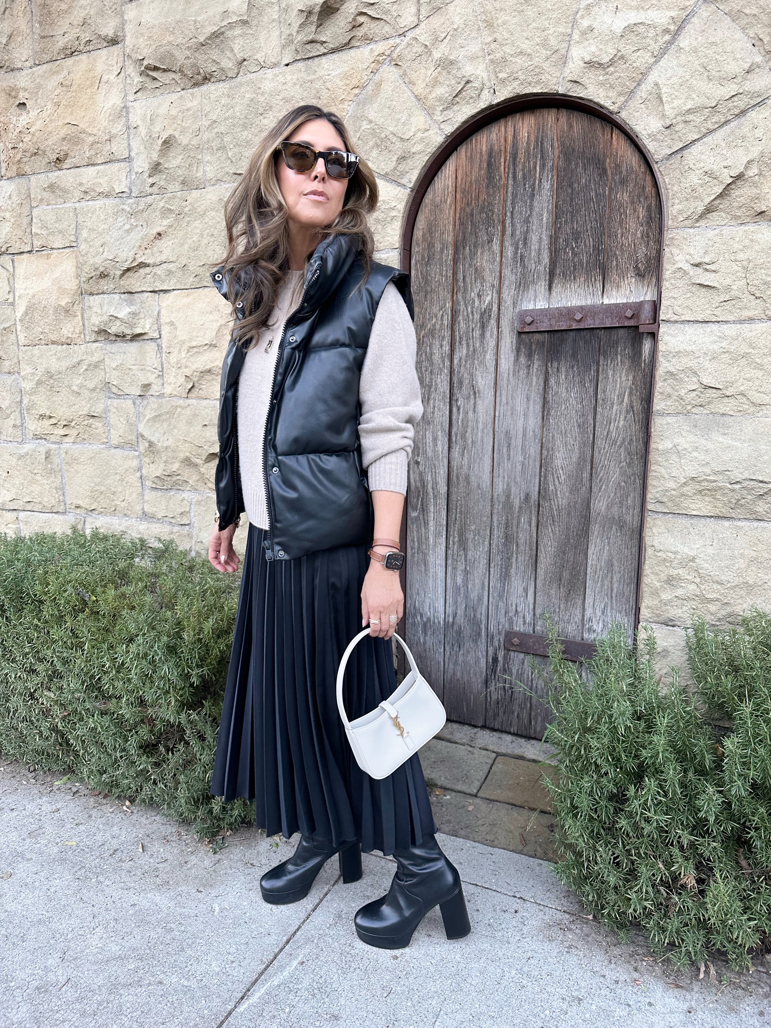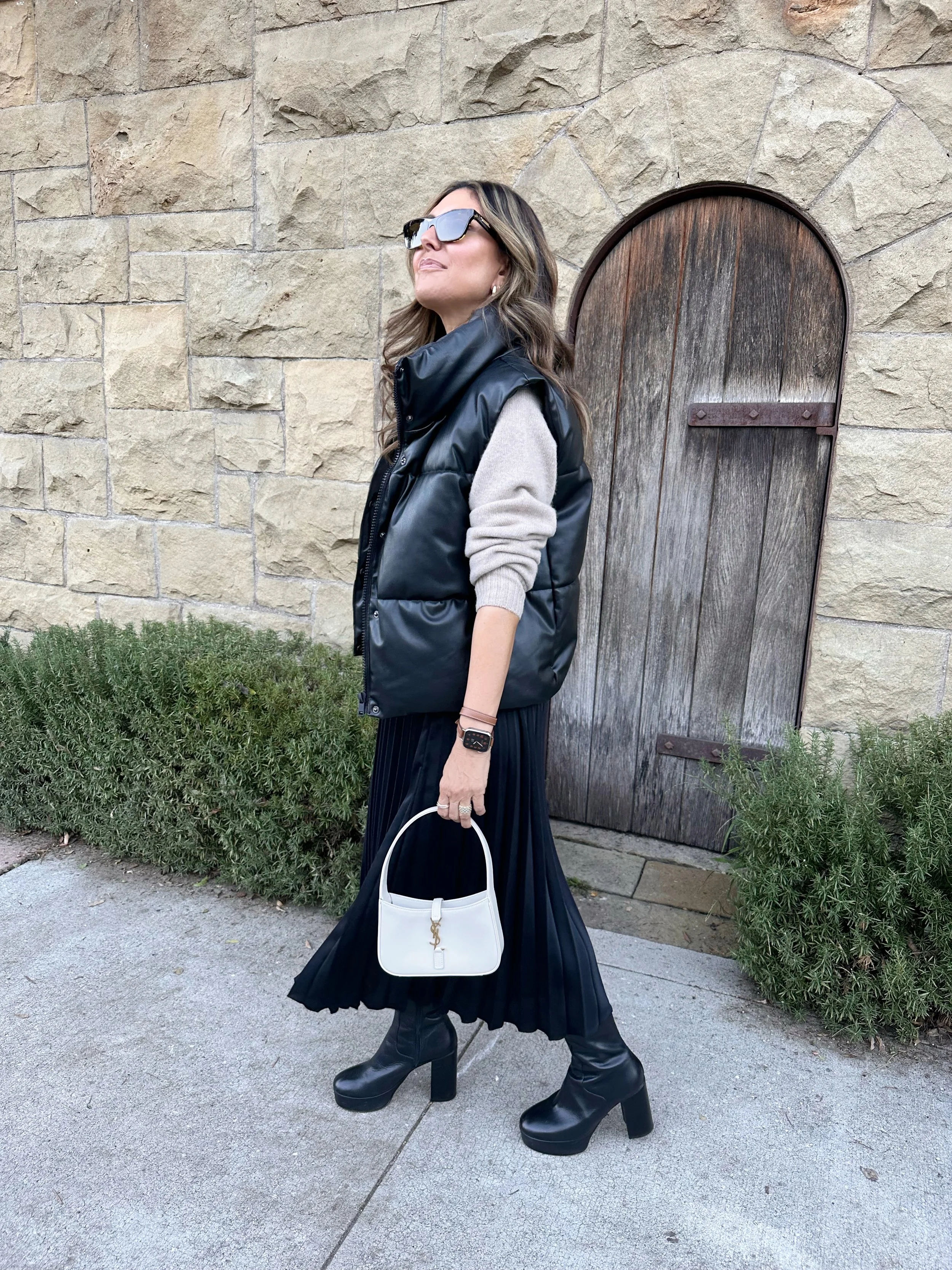 I love the elevated look and feel of wearing a faux leather puffer vest. This one is oversized and boxy which gives an edgy twist to a feminine outfit. Puffer vests are super trendy this year and can be worn into the spring—I wear mine everywhere from the gym to dinner!