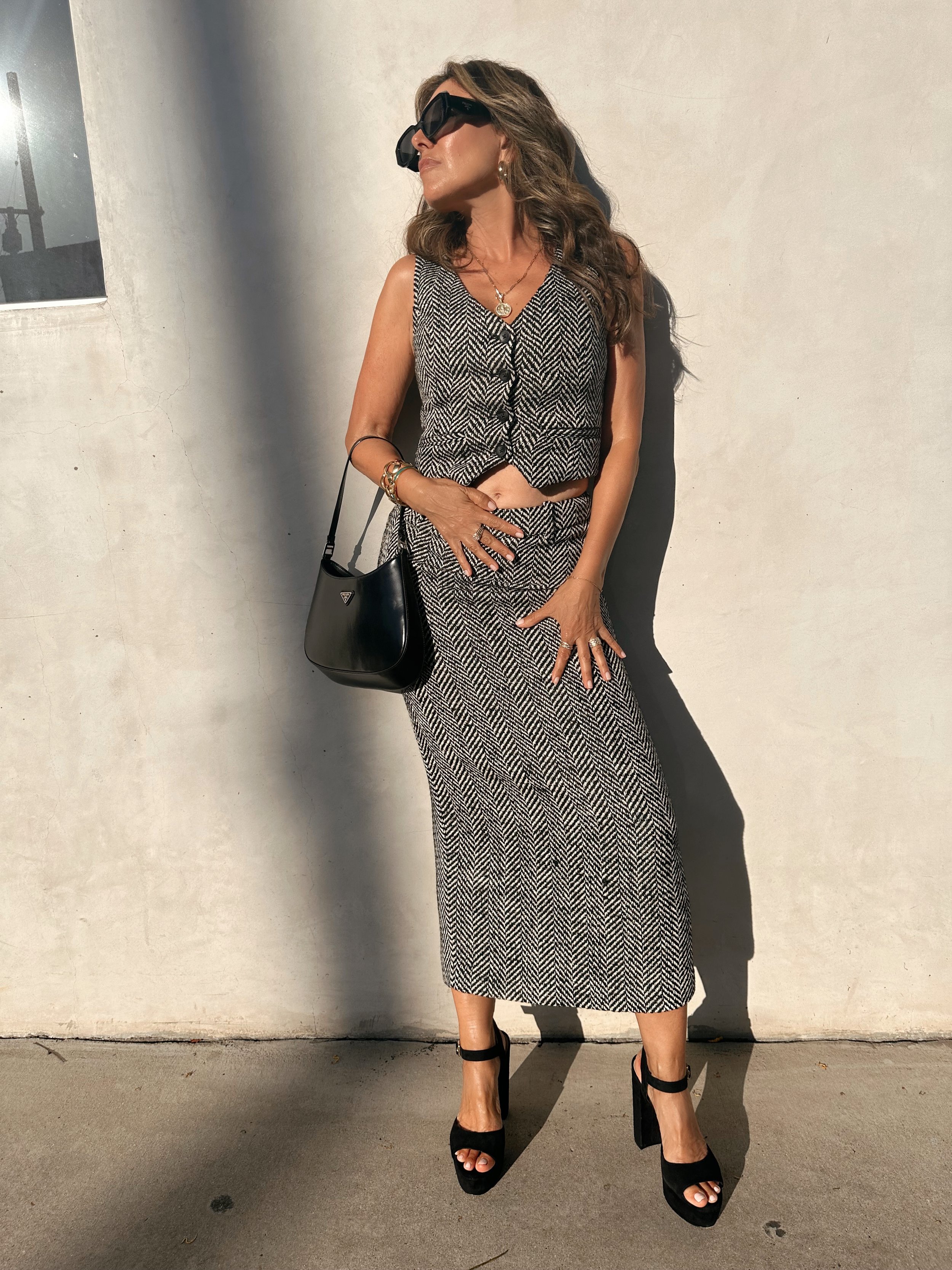 The intricate herringbone pattern has a vintage “old school” vibe, making it a versatile piece that effortlessly elevates any look. Crafted with attention to detail and quality, this stylish vest is fitted and hugs my body. You can even layer it with a thin long sleeve sheer top during the winter for added warmth.