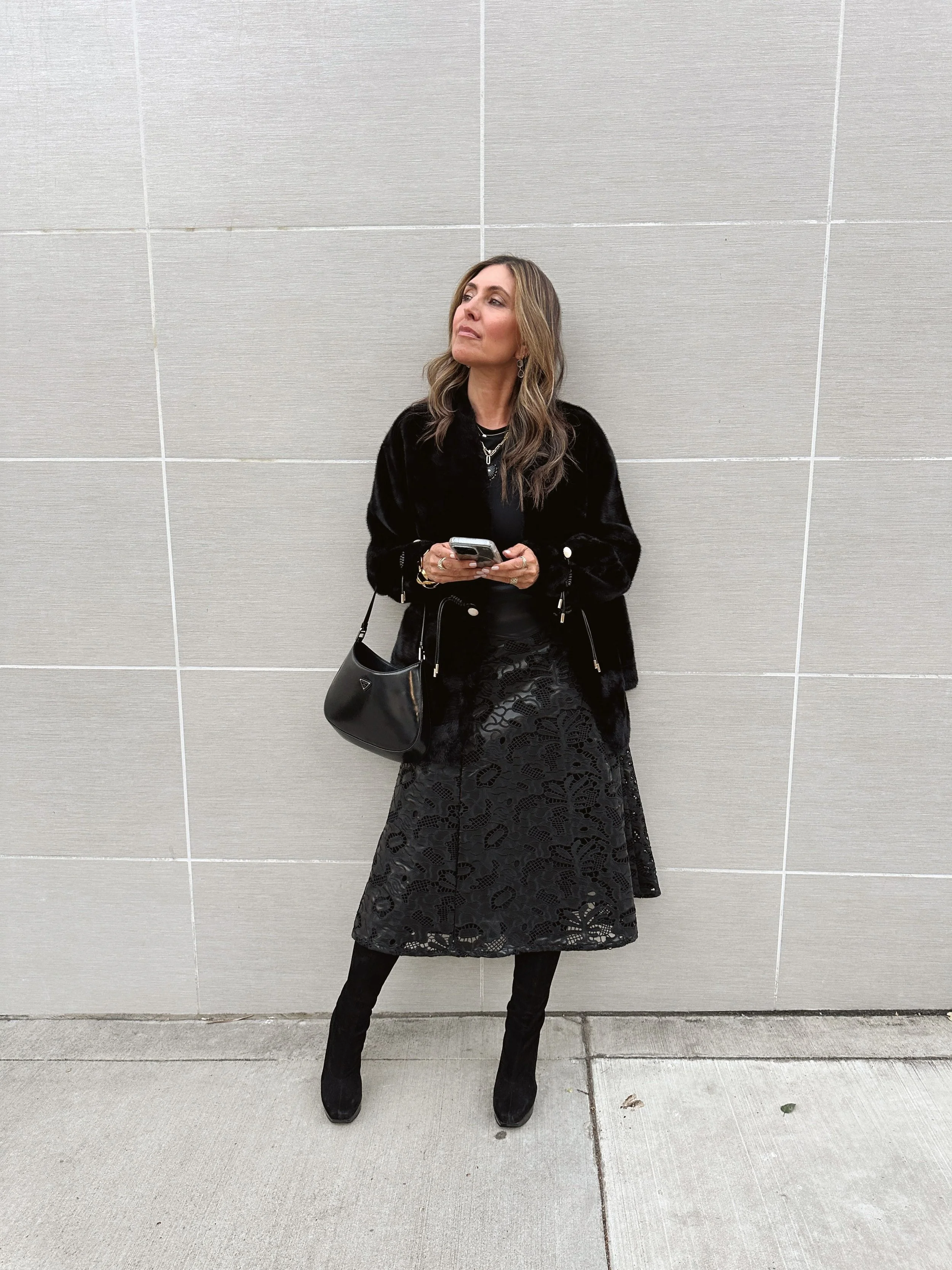 Allison New York Faux Leather Lace Skirt paired with a Pumiey black fitted top, Prada bag on sale HERE, Faux fur (similar HERE). Heart necklace is by Thatch Jewelry.