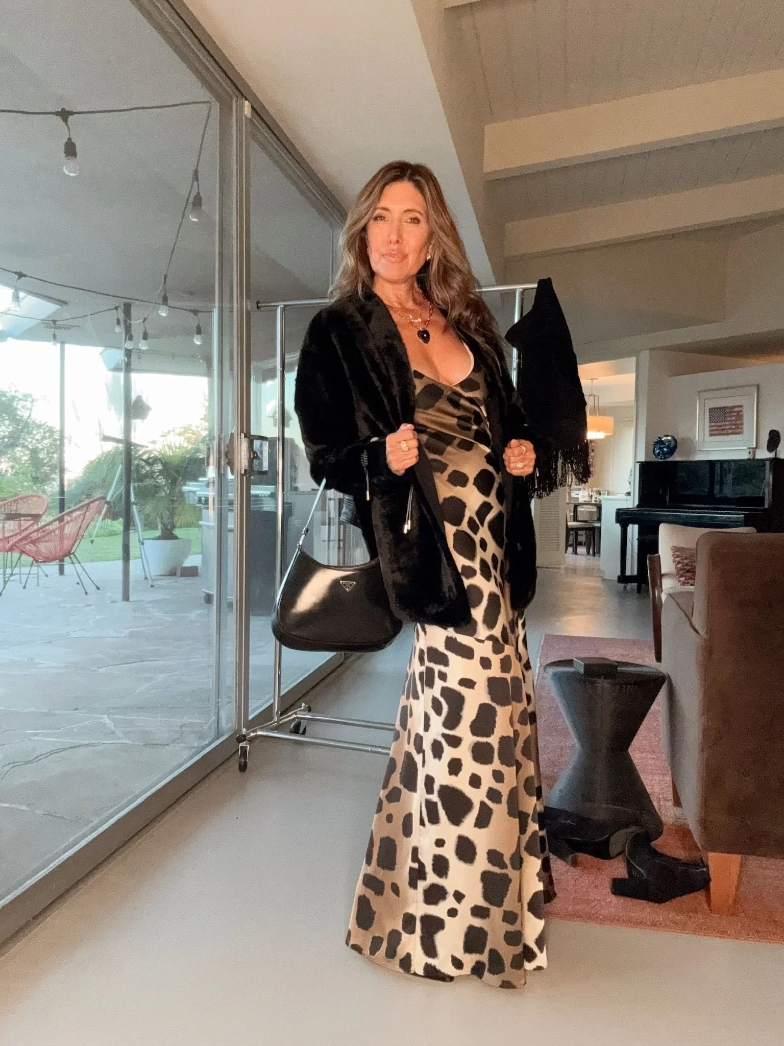 Leopard print is always in style, and this Benaar La slip maxi dress epitomizes effortless elegance. The dress is almost sold out so you can shop similar HERE. The faux fur jacket is sold out in black but you can shop it in other colors HERE. Or, shop a similar style in black HERE.