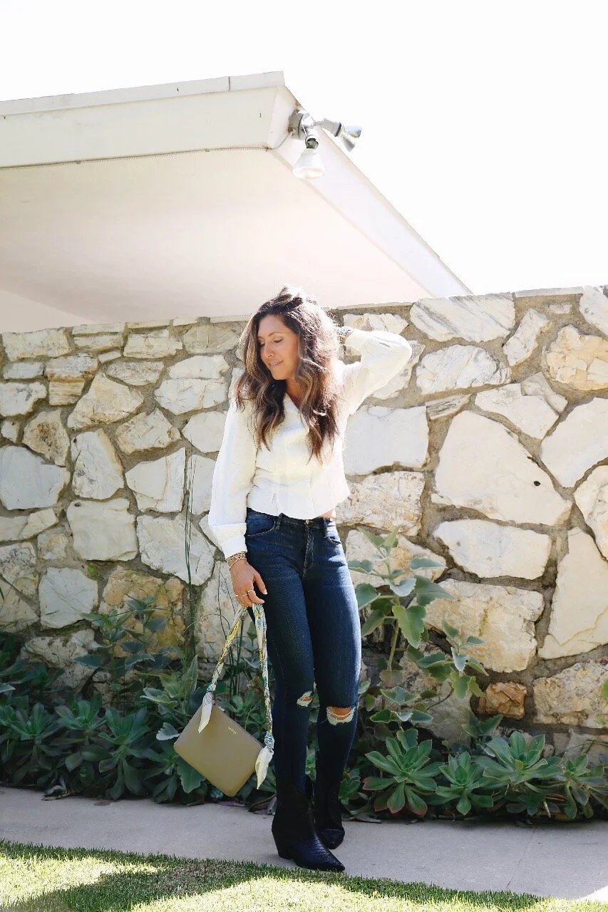 Here I’m wearing the Lenora White Silk Blouse with Puff Sleeve. It pairs seamlessly with any denim!