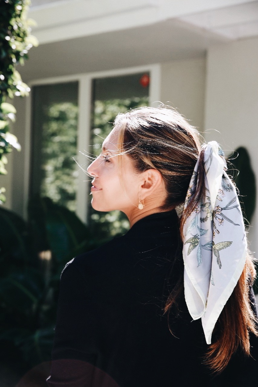 The scarf is having a moment. Whether tied around your ponytail, or worn on your head to hide a bad hair day, this accessory is working over-time this spring.