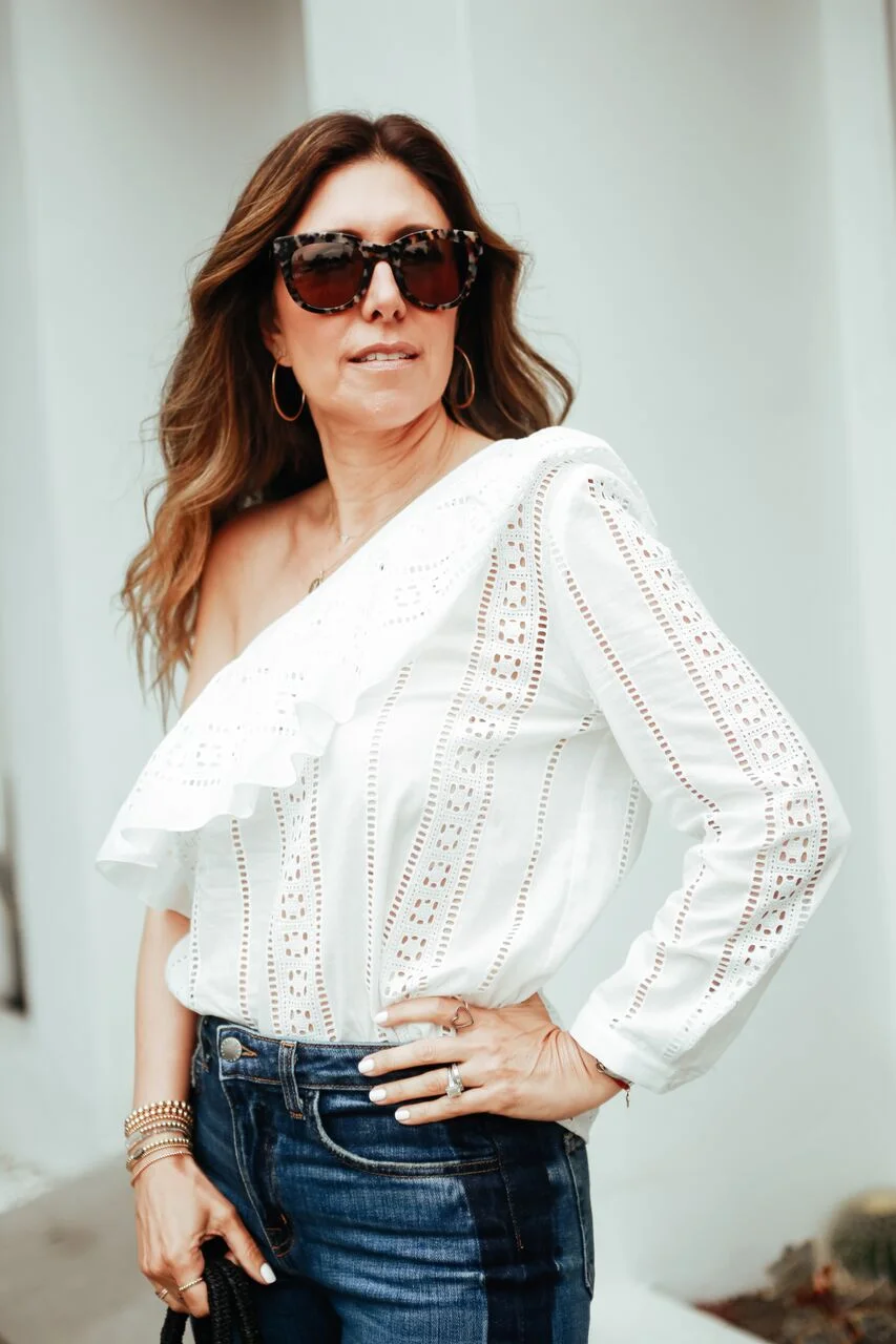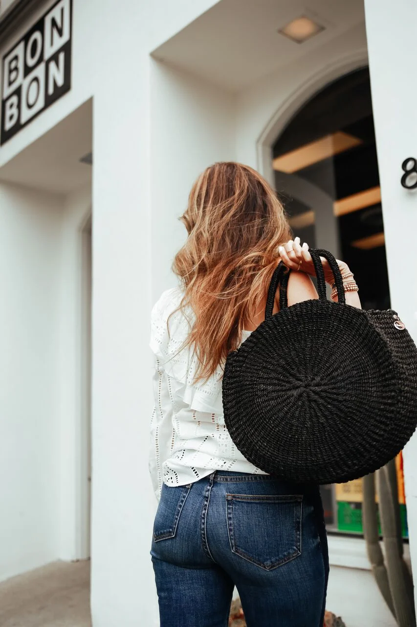 I am really loving all of the feminine spring fashion this season. Florals, high-waisted jeans, round bags and one shouldered tops and dresses. One of my favorite new finds is this white off the shoulder top by Veronica Beard! I have purchased several pieces from the collection will be posting them throughout the next few weeks. I am also obsessed with this round Clare V bag as it will be my go-to tote for summer!