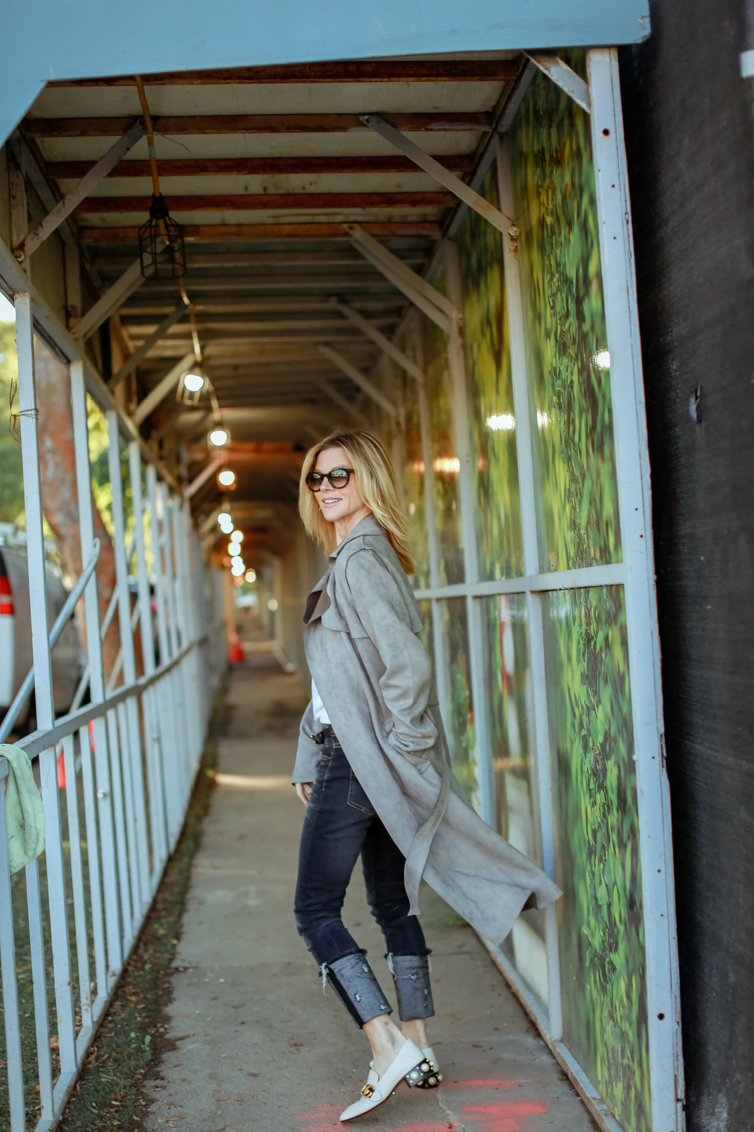 A trench coat is always tres chic! Especially when combined with a classic white t-shirt and on trend denim. Checks all the boxes!